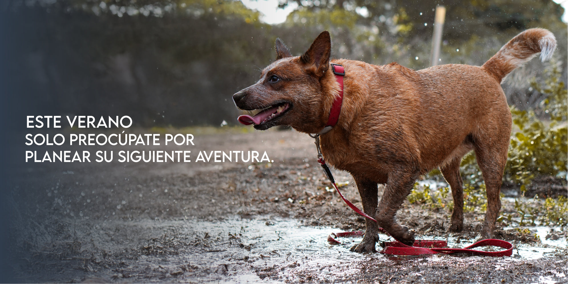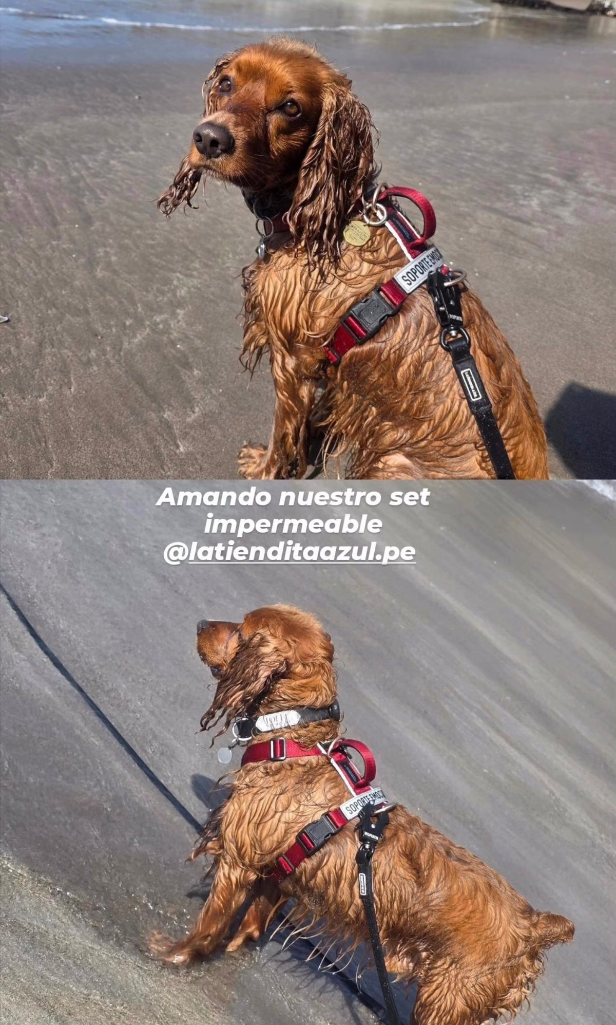 Toffe disfruta la playa, por eso utiliza nuestros collares y correas todoterreno, junto con su arnés clásico en talla S y plaquita de identificación.